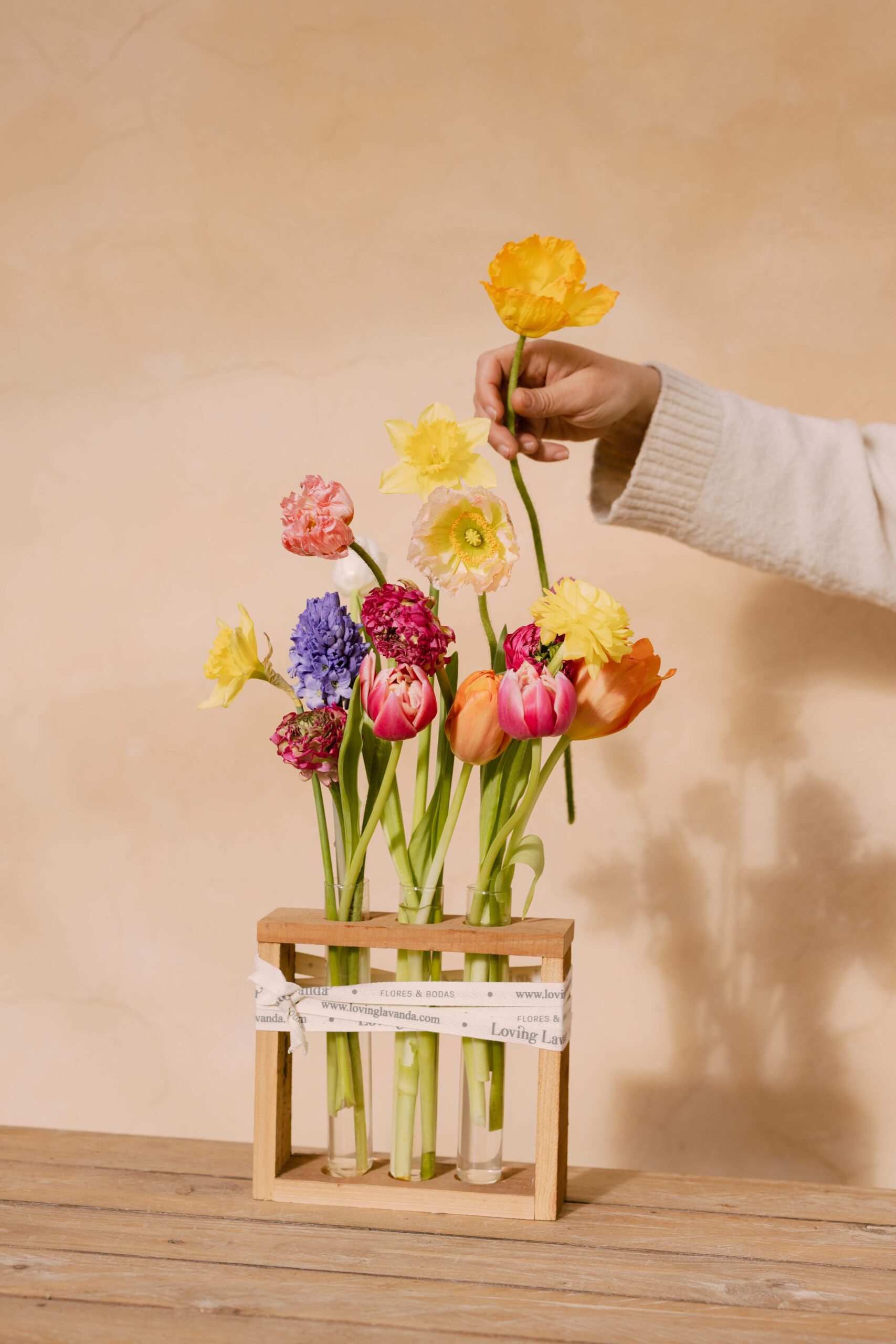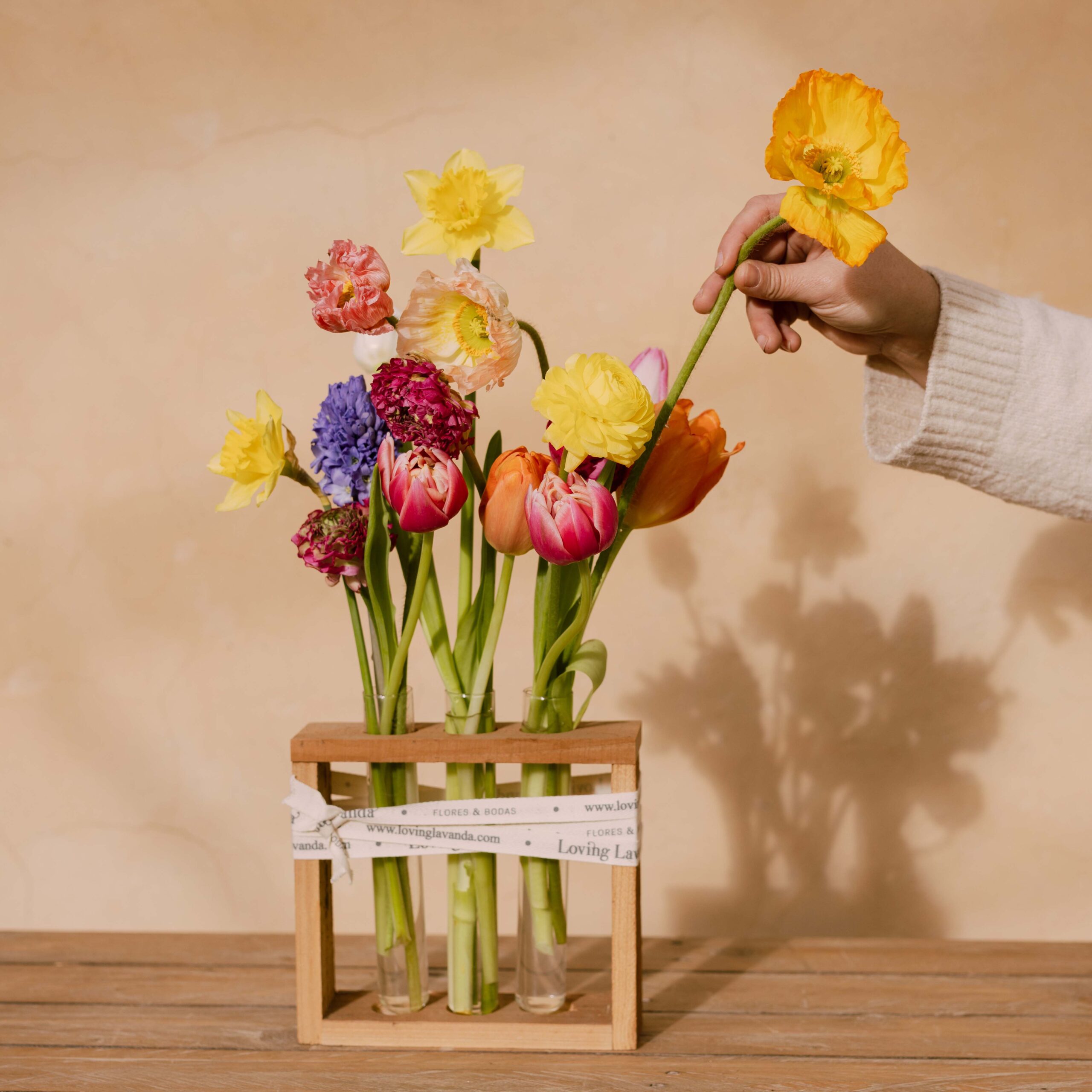 Base de madera con probetas de vidrio que sostiene una delicada selección de flores bulbosas de temporada. El arreglo incluye tulipanes, narcisos y amapolas, dispuestos de forma ligera y natural para resaltar la belleza individual de cada flor.