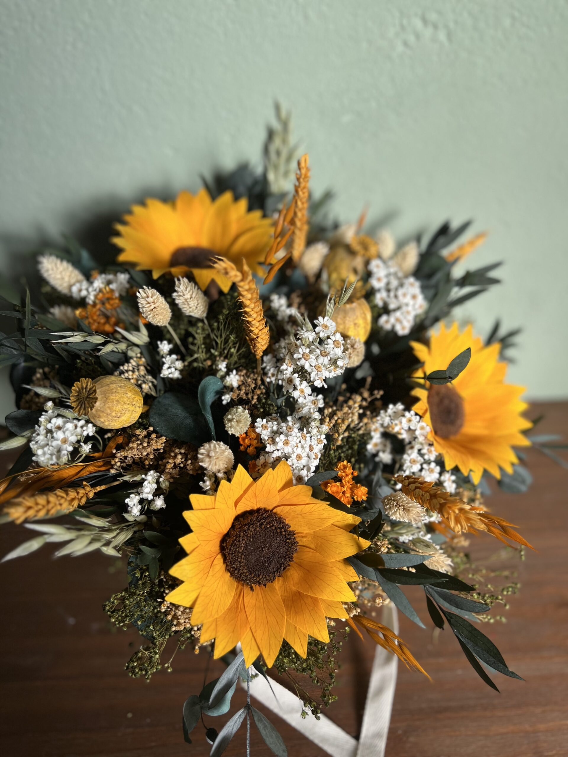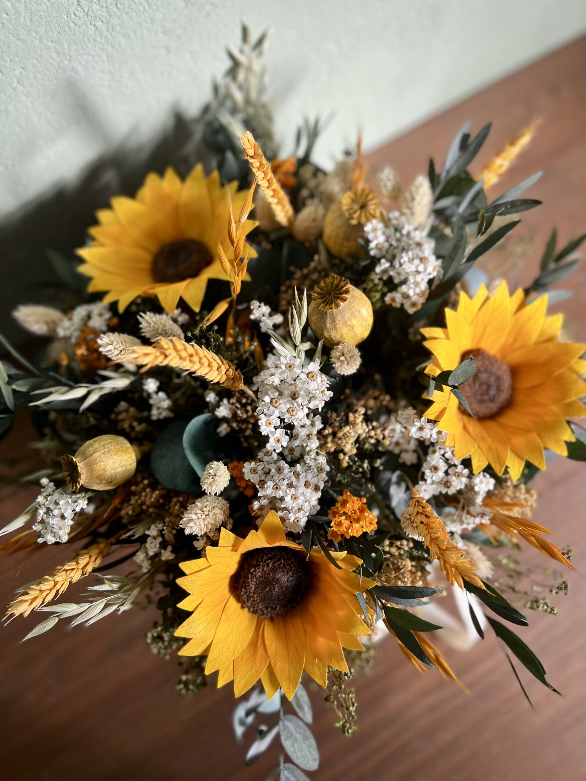 Este arreglo está compuesto de flores preservadas y secas. Lleva 3 flores de girasol preservado, base de eucalipto, mezclado con margaritas, trigo  y otras flores de relleno de estilo campestre en una cesta de mimbre.
