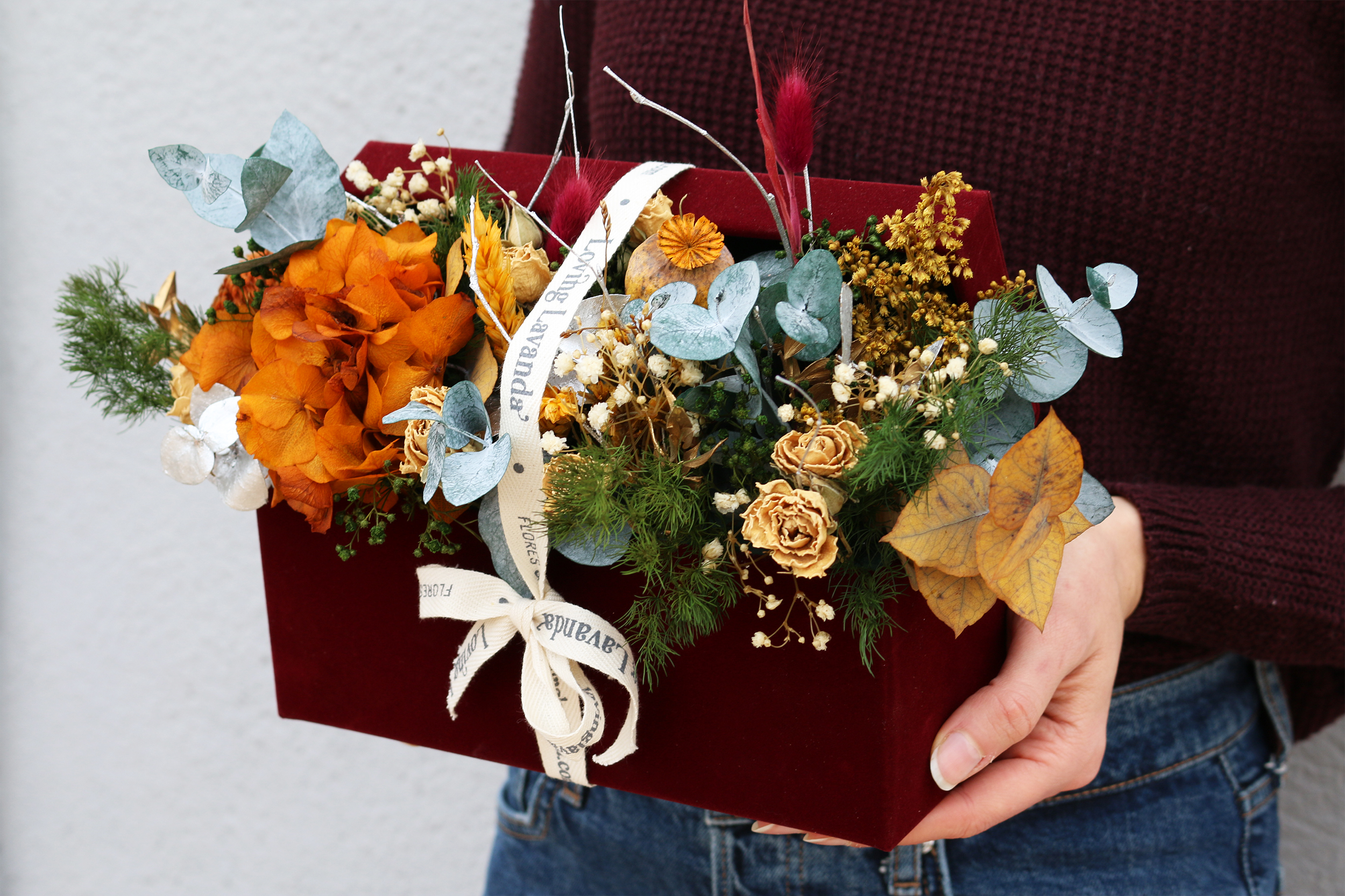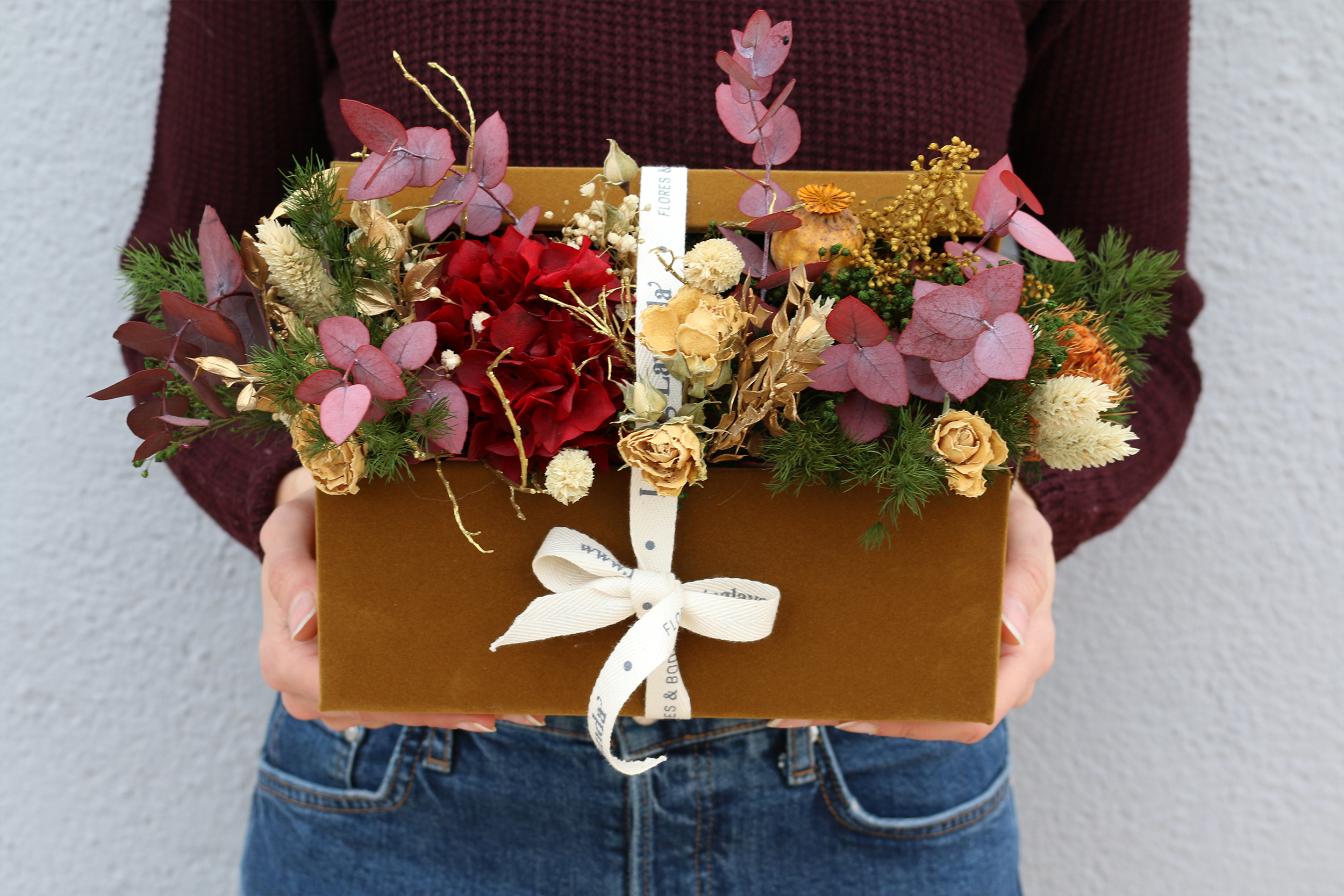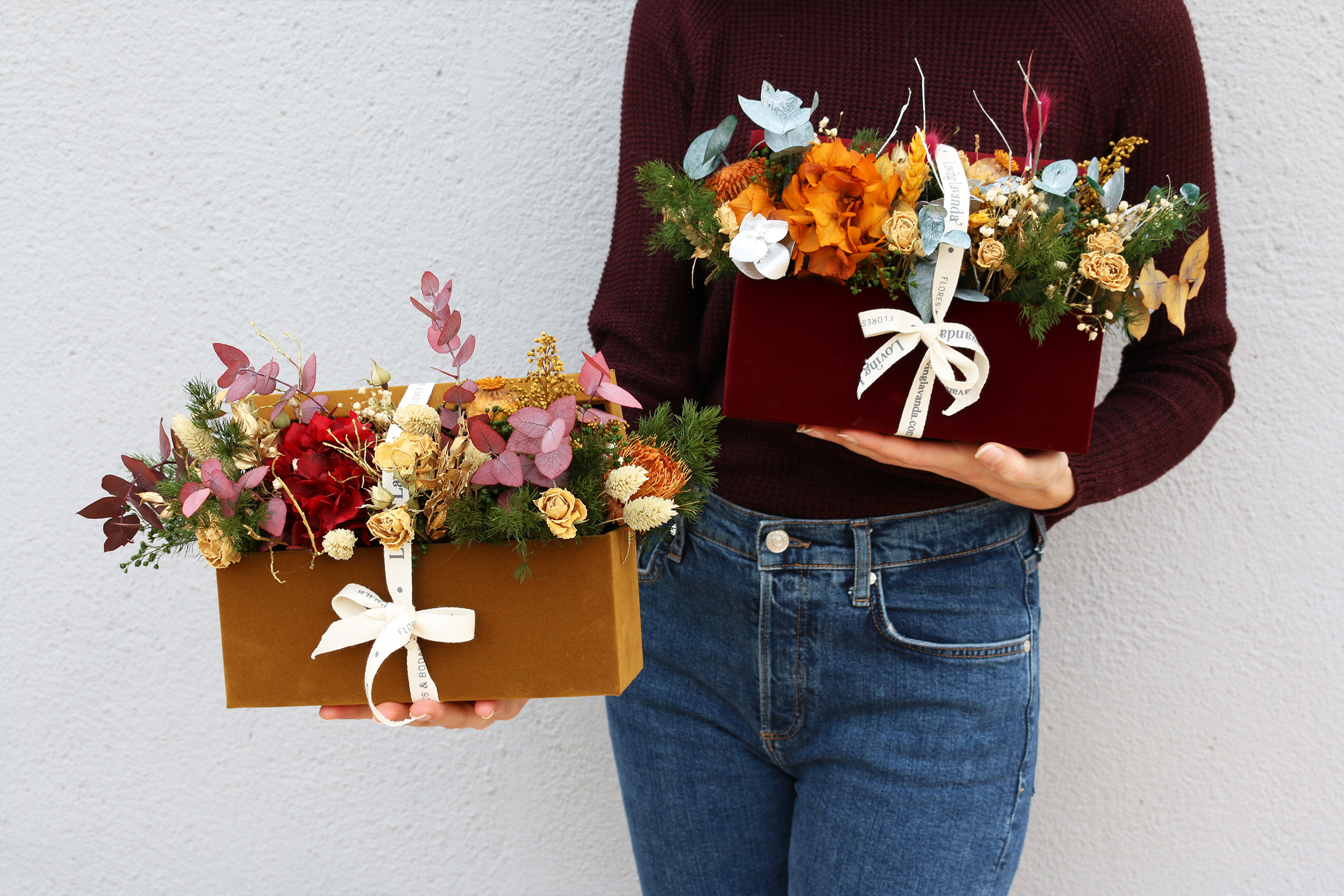 Cofre de terciopelo lleno de flores preservadas y secas. Puedes elegir el cofre color burdeos o mostaza y las flores irán acordes.