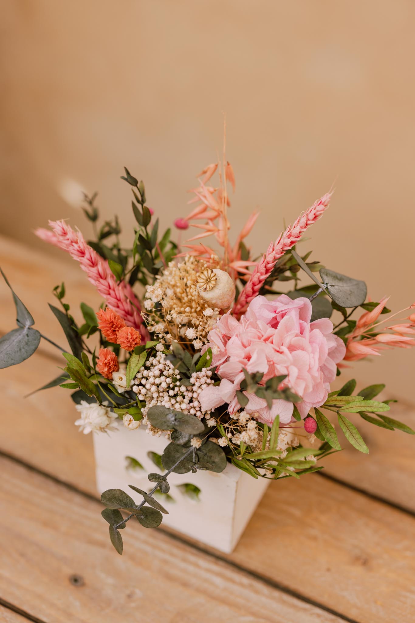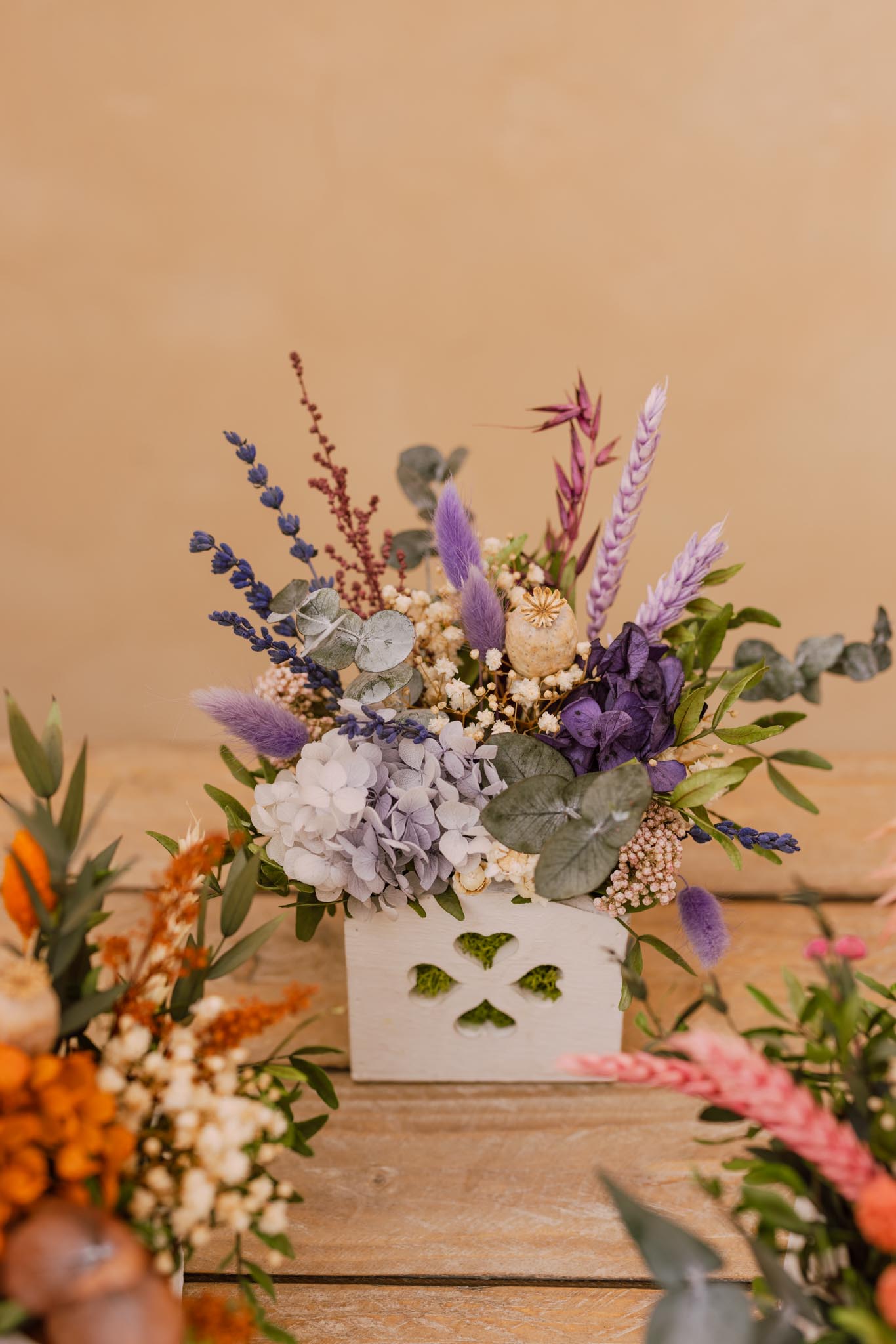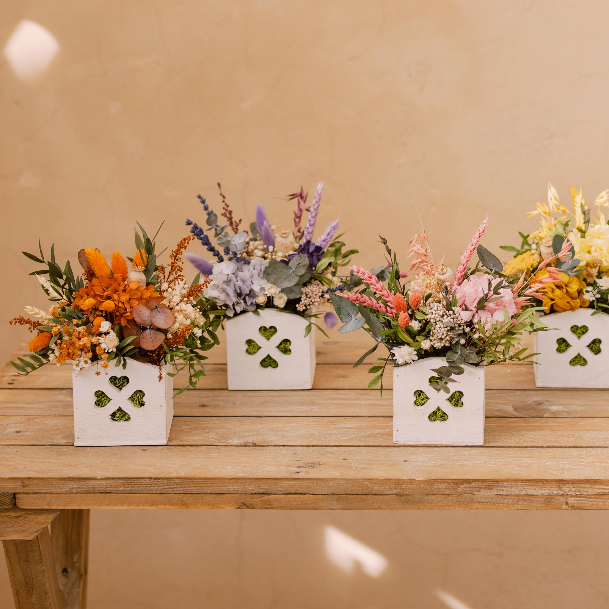Este arreglo está compuesto de 5 cajitas de madera, cada una lleva una composición de flores preservadas, cada cajita tiene una gama de color distinta. Siempre lleva base de eucalipto y helecho, mezclado con hortensia, paniculata, trigo  y otras flores de relleno.
