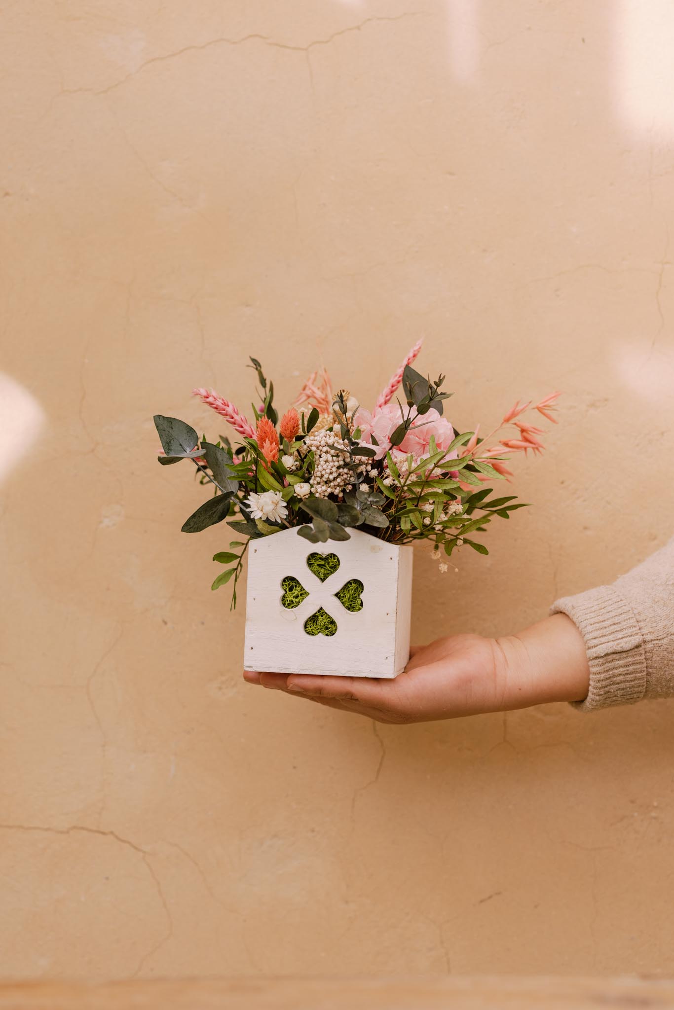 Lo que sí te aseguramos es que va a tener la misma esencia, los colores y el estilo. Si hay alguna flor que no está disponible en ese momento, la sustituimos por otra similar sin perder la armonía y el carácter del diseño.