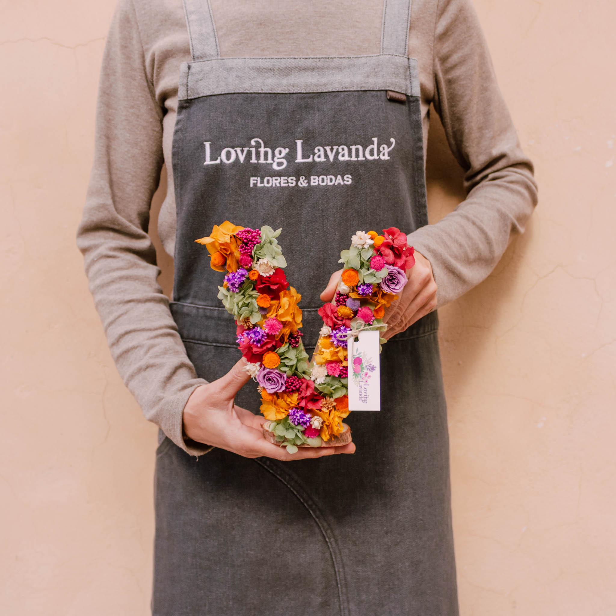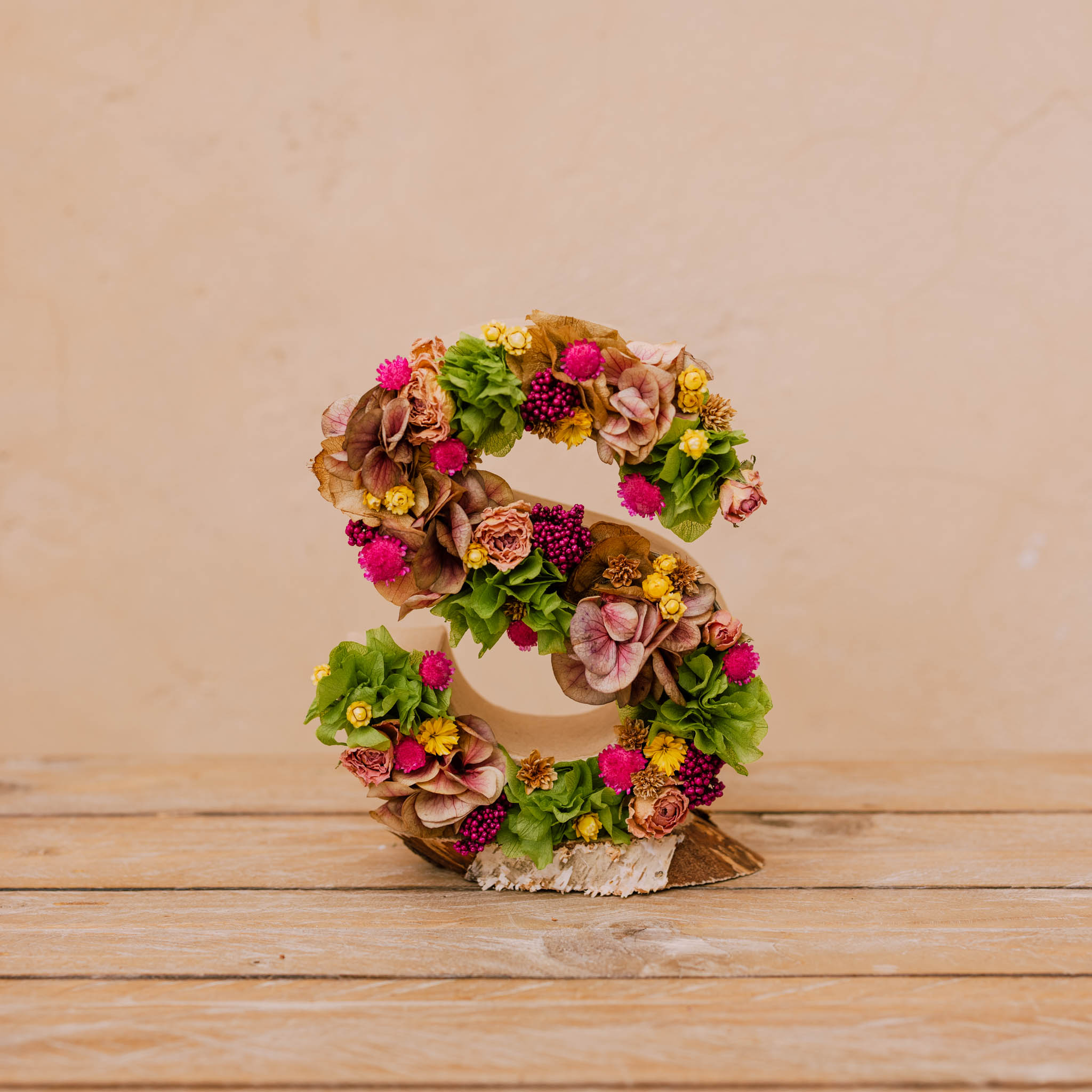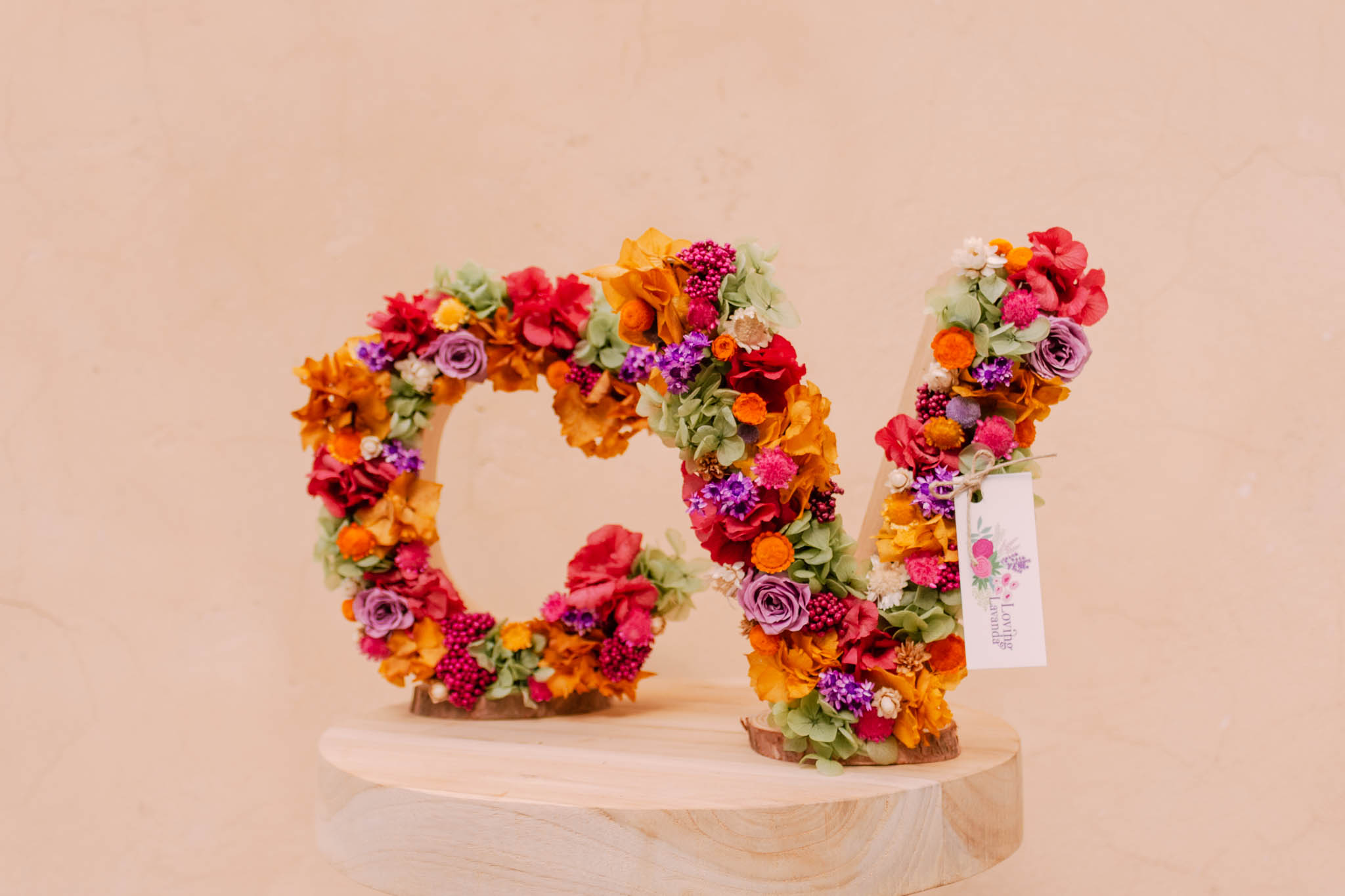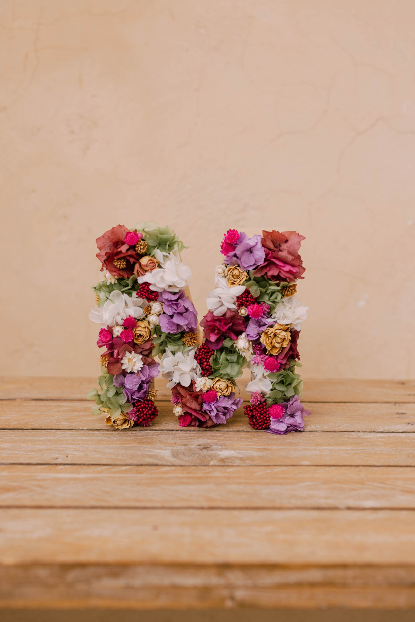Letra de flores preservadas y secas de los colores que prefieras, montadas a manos sobre una base de cartón y con una peana de madera.