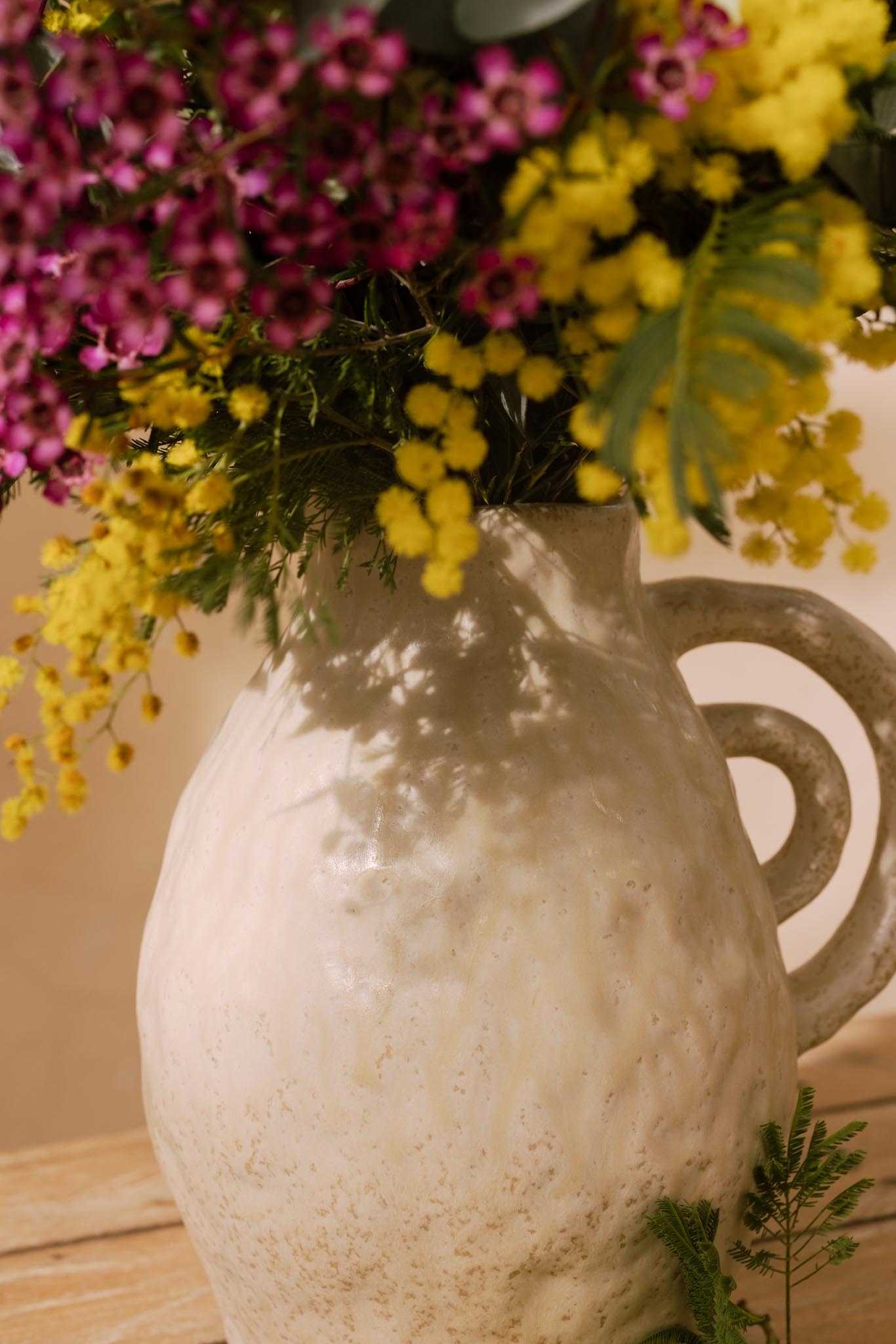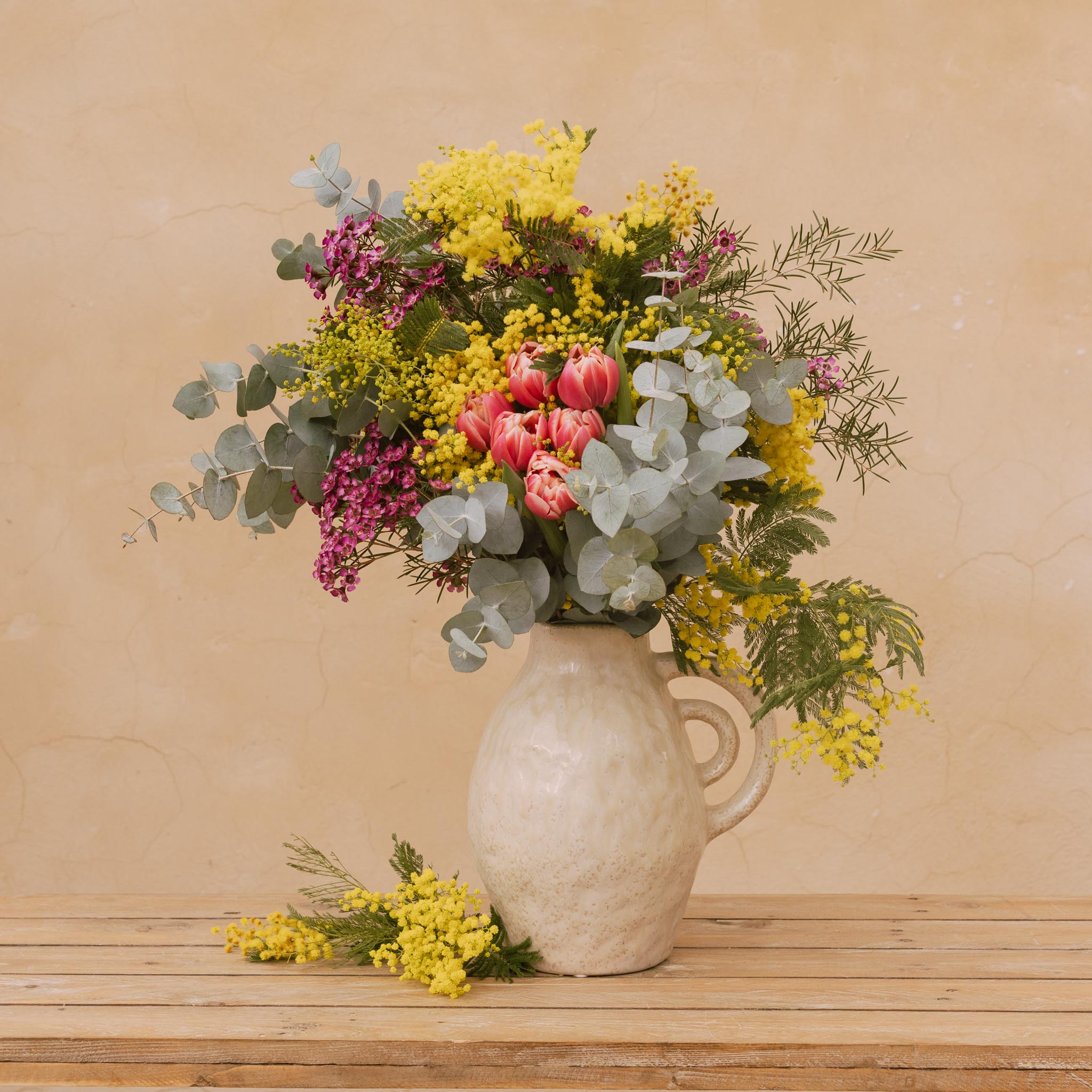 Jarrón de cerámica con un ramo de flores frescas de temporada, compuesto por mimosa, tulipanes, flor de cera y eucalipto. Una combinación natural y luminosa que aporta color y frescura a cualquier rincón del hogar. La textura artesanal del jarrón y la delicadeza de las flores crean un arreglo elegante y lleno de vida. Ideal para secar.