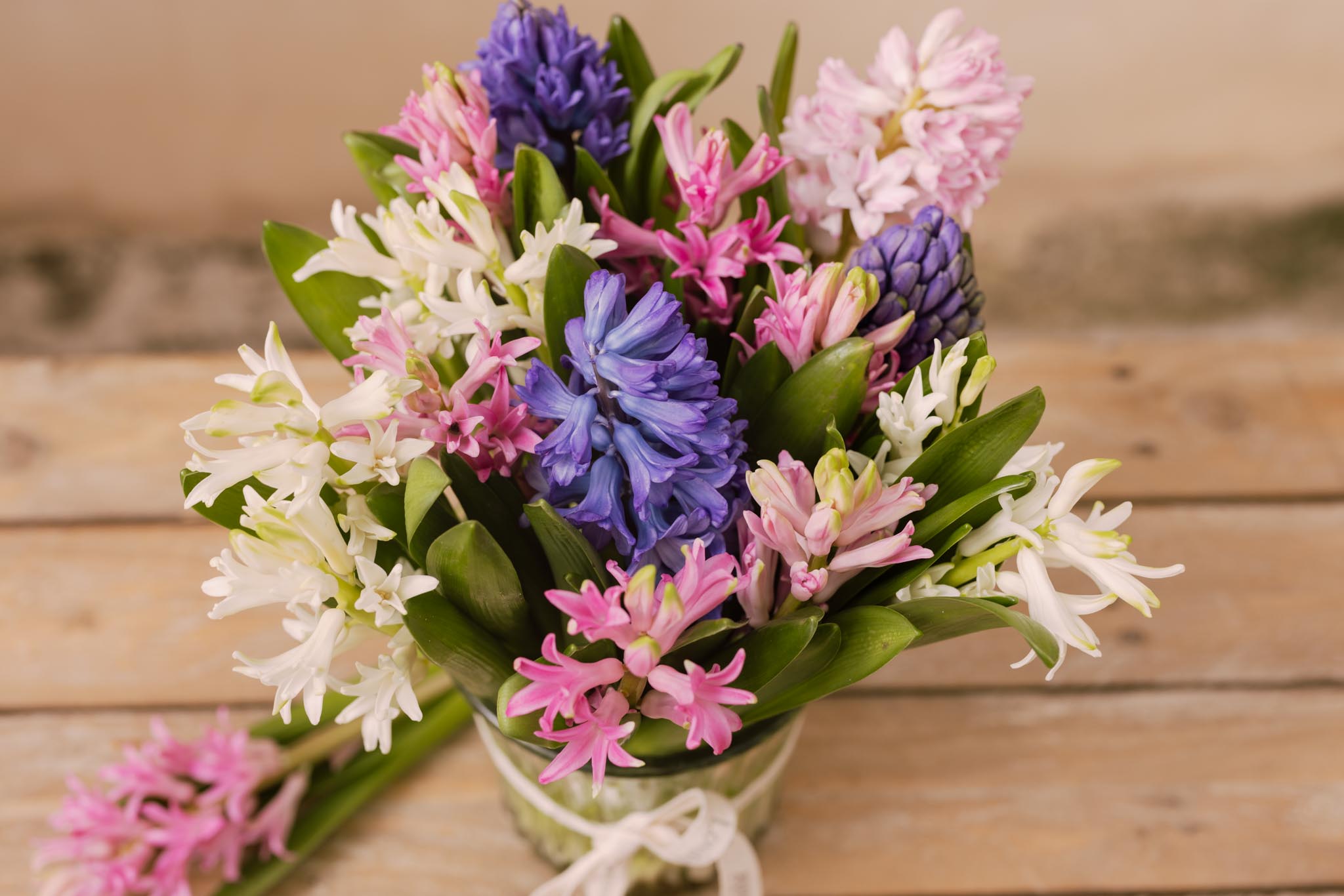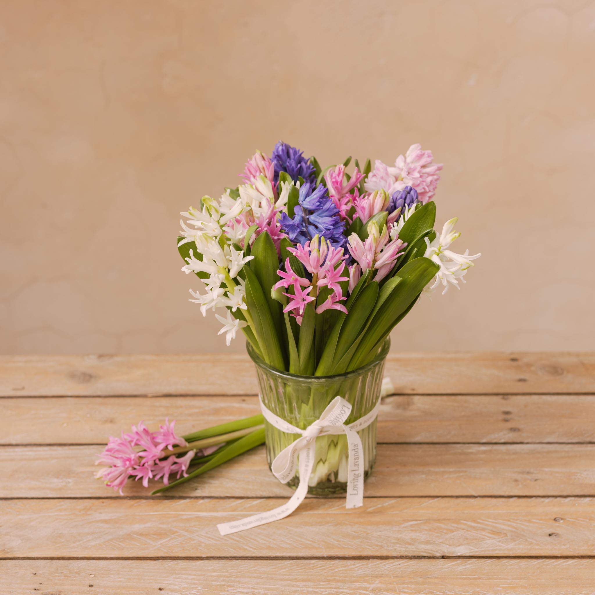 Jarrón de cristal con una abundante selección de jacintos en distintos tonos, formando una composición fresca y muy primaveral. Sus tallos firmes y sus flores delicadas aportan volumen, color y un perfume natural que llena el espacio de una atmósfera agradable.