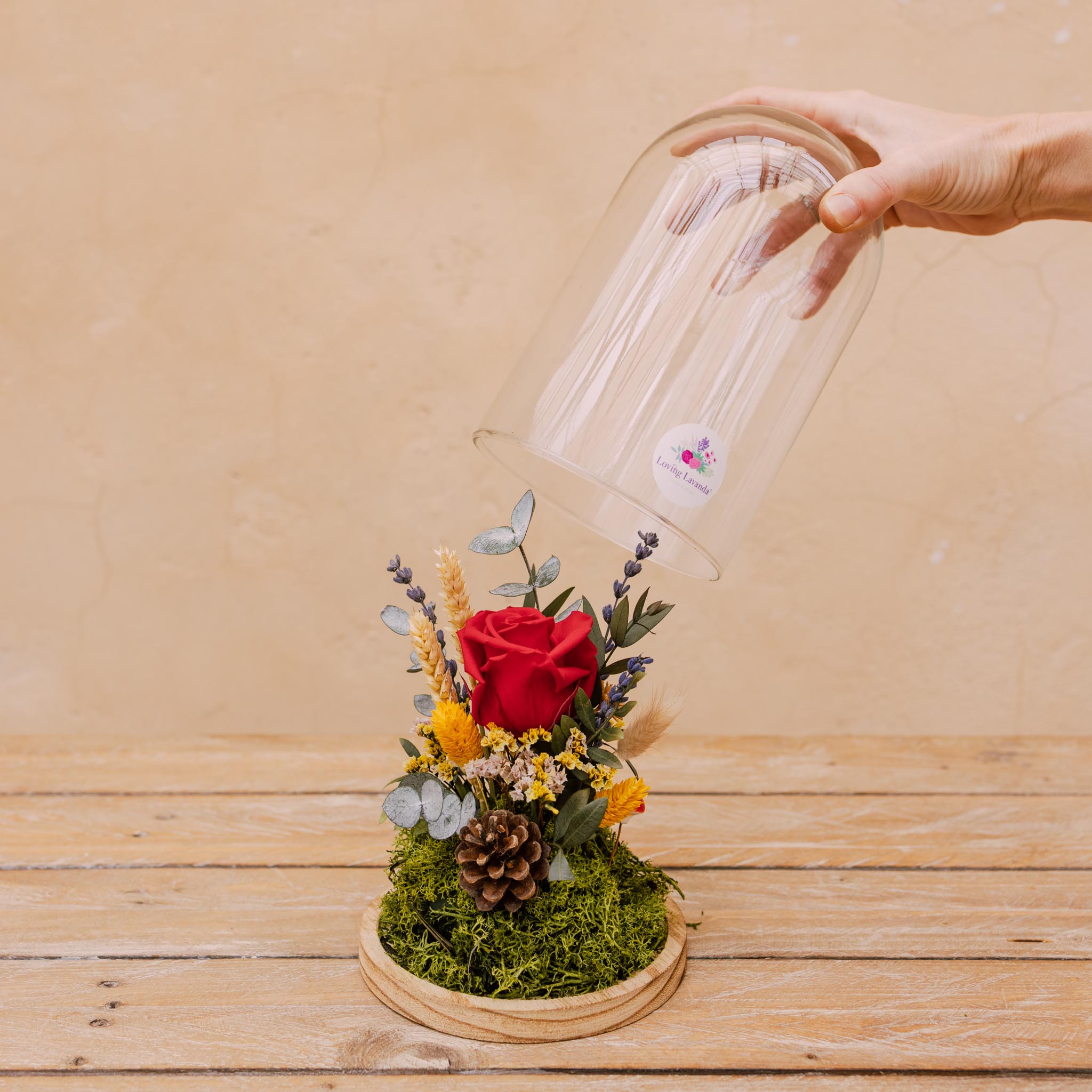Descubre la magia de un jardín que nunca se marchita. Esta delicada rosa preservada se encuentra en el corazón de una elegante cúpula de cristal, rodeada de pequeñas flores preservadas que crean un universo en miniatura lleno de color y vida. Cada detalle transmite cuidado y armonía, convirtiendo este arreglo en un regalo perfecto o en un objeto decorativo que aporta belleza y serenidad a cualquier espacio.